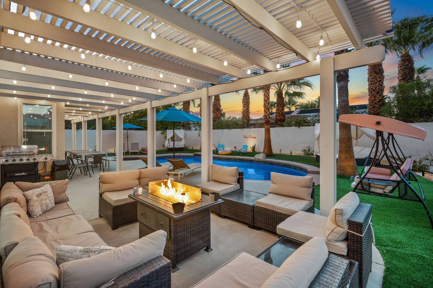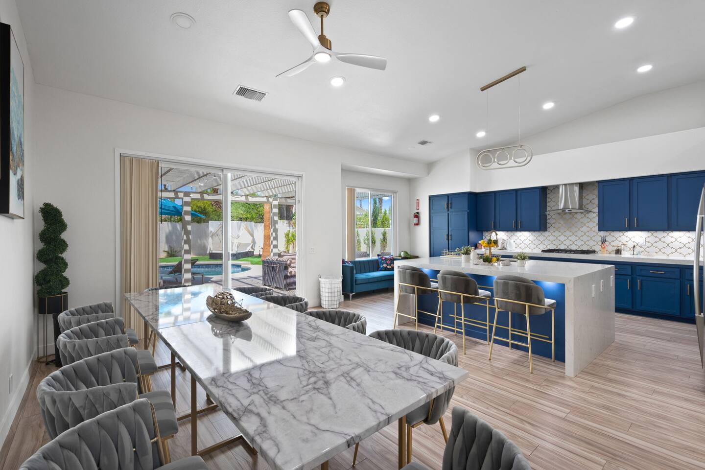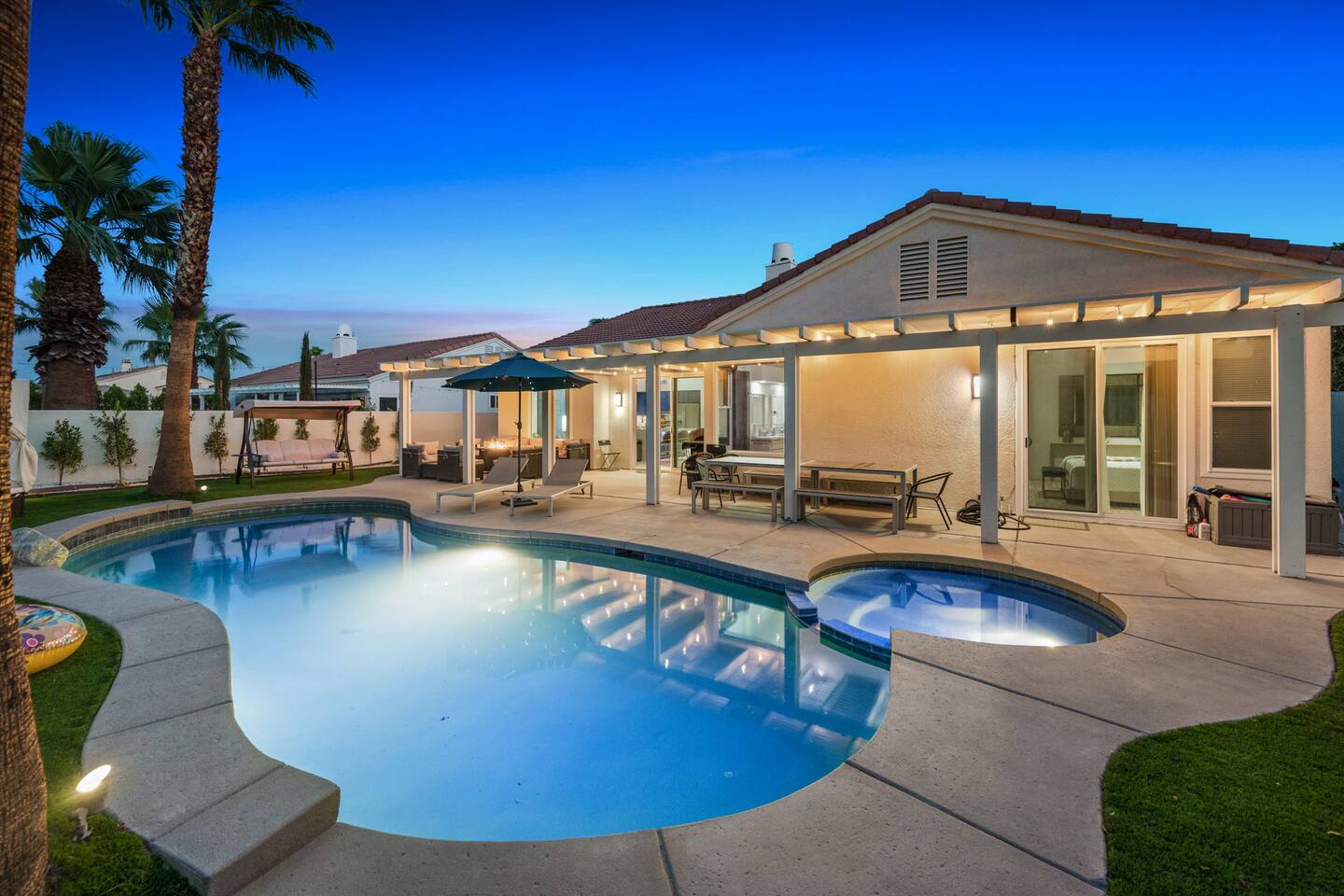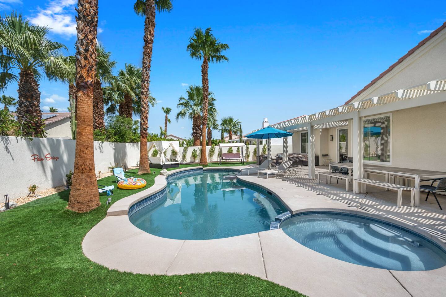 Beautiful luxury home for large groups, sleeps 10. Huge gourmet kitchen with massive marble dining table opens to pool, spa, fire pit, BBQ and outdoor dining. Non-smoking. Minutes from downtown Palm Springs on a quiet street; close to hiking, 30 minutes to Coachella & Stagecoach. Dogs 🐶 welcome! Chef's kitchen fully stocked. Enjoy your favorite shows on a 75” TV with comfy lay down couches. Play pool and games in our game room that also has a portable infrared steam sauna City ID 06877