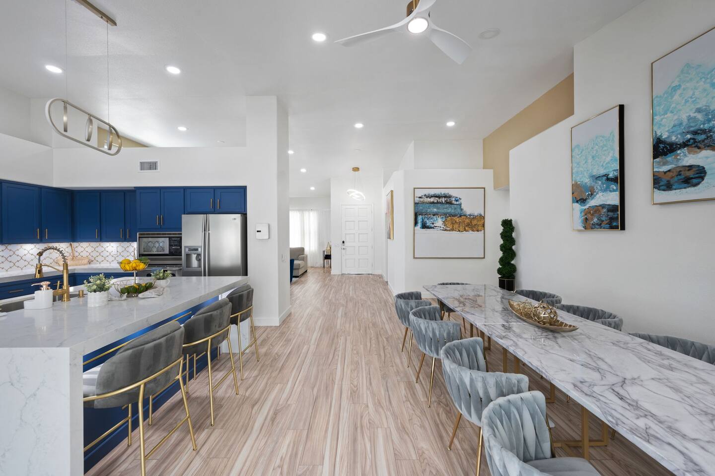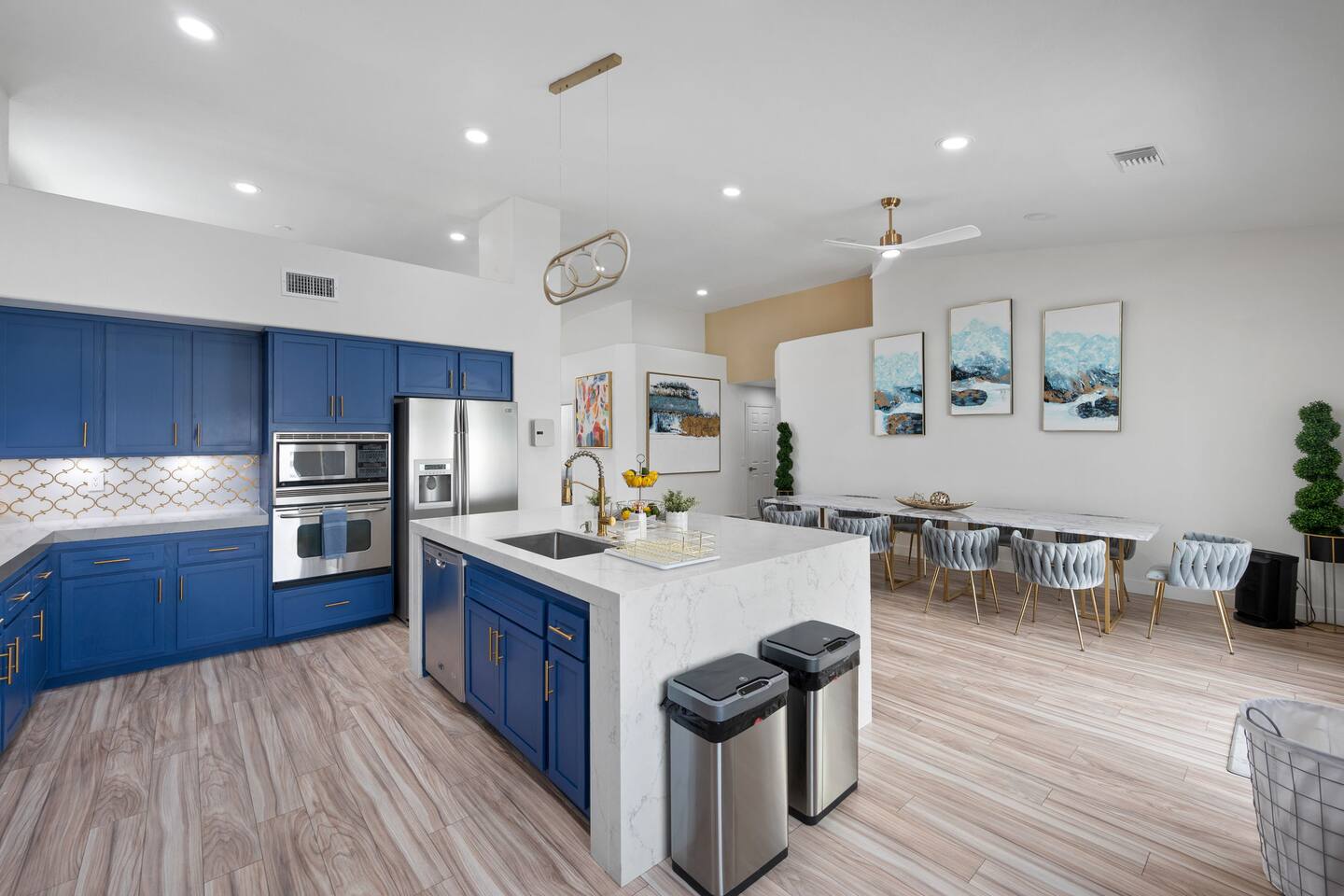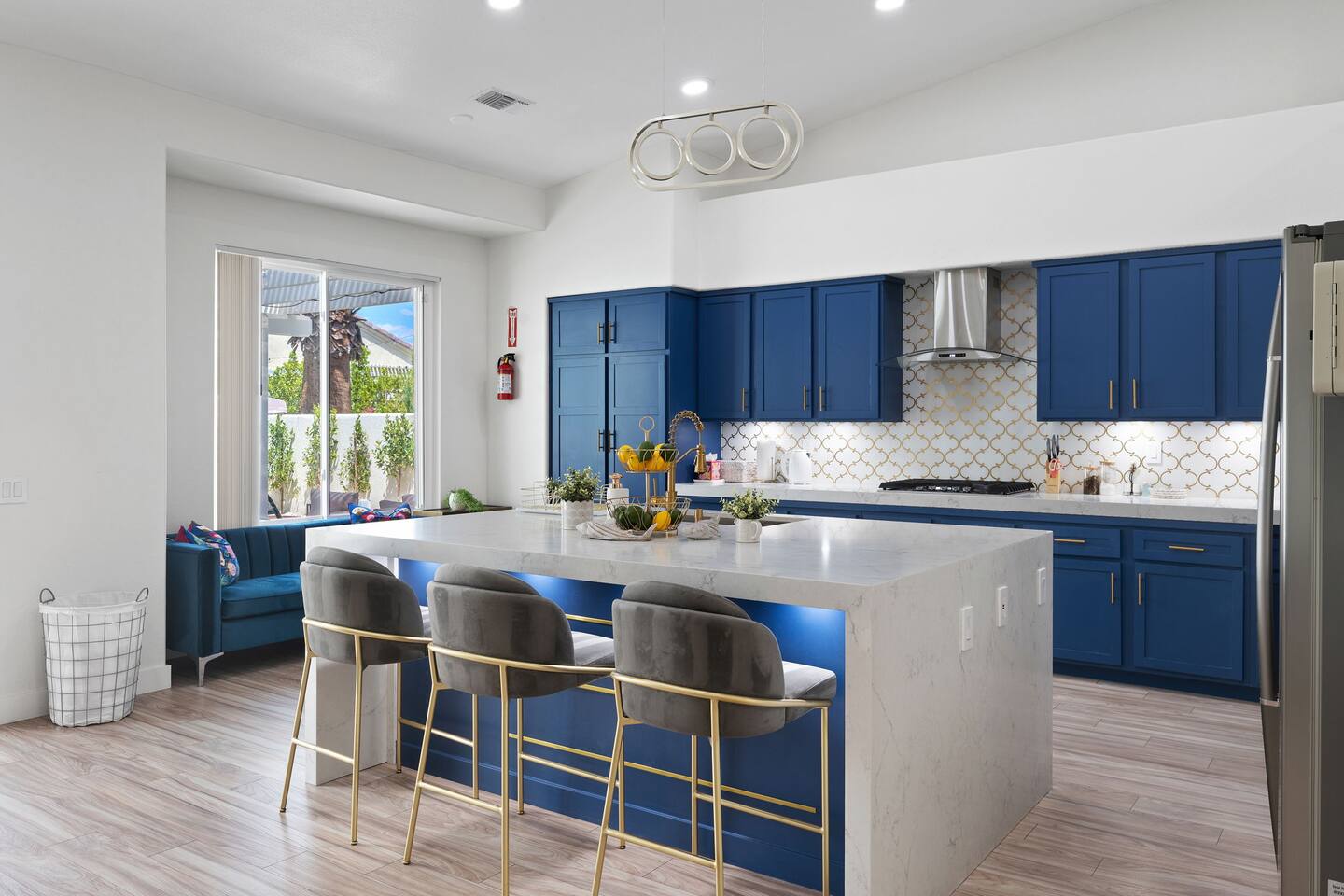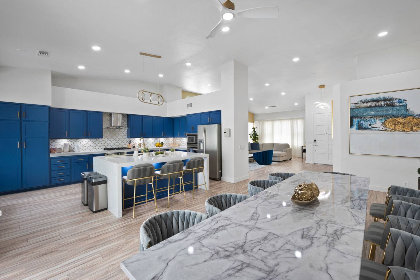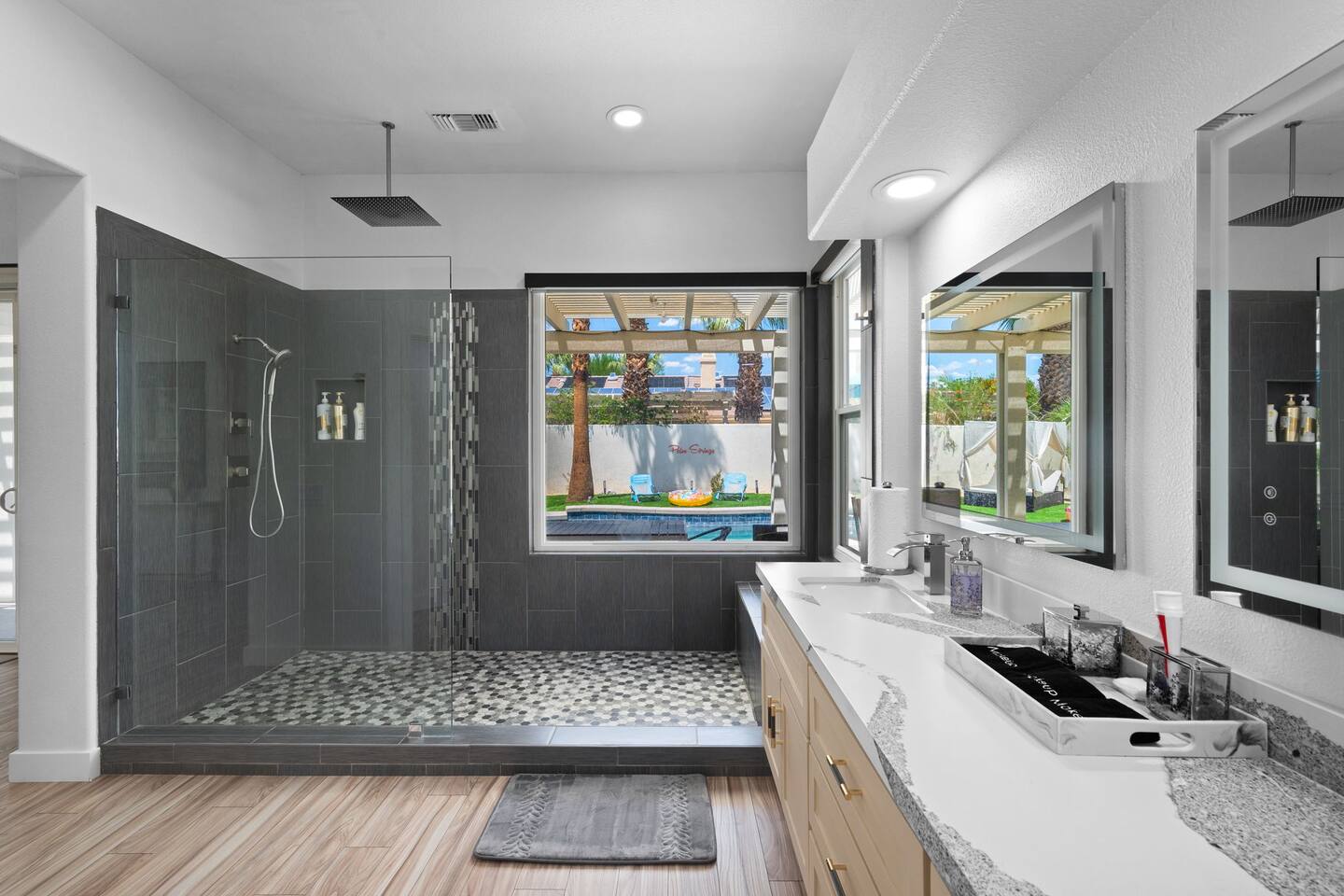 Beautiful luxury home for large groups, sleeps 10. Huge gourmet kitchen with massive marble dining table opens to pool, spa, fire pit, BBQ and outdoor dining. Non-smoking. Minutes from downtown Palm Springs on a quiet street; close to hiking, 30 minutes to Coachella & Stagecoach. Dogs 🐶 welcome! Chef's kitchen fully stocked. Enjoy your favorite shows on a 75” TV with comfy lay down couches. Play pool and games in our game room that also has a portable infrared steam sauna City ID 06877
